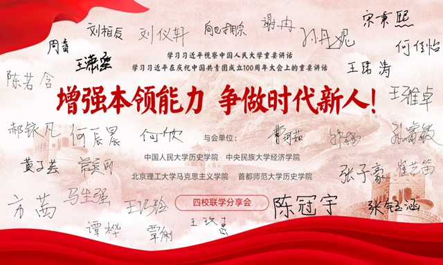 5月13日下午,为深入学习习近平总书记4月25日视察中国人民大学的重要讲话精神,感悟新时代青年如何响应时代发展呼唤、在青春的赛道上跑出最好成绩,澳门十大信誉好的网站联合中国人民大学历史学院、中央民族大学经济学院、首都师范大学历史学院在线上举办主题为“增强本领能力,争做时代新人”联学共建活动。
