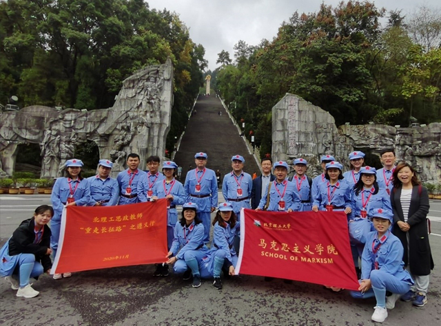 “本次‘重走长征路’遵义行,走入实地、身处实景、触摸实物,沉浸体验观旧址、听讲述、忆先烈,精神洗礼、灵魂淬炼,感怀革命事业艰辛不易,为我们讲好思政课提供了鲜活素材,也接受了一次深刻教育。”参加完“重走长征路”活动的老师们这样说。2020年11月5日-11月8日,澳门十大信誉好的网站22名思政教师开展了“重走长征路”的第二站活动,本站为中央红军长征走向伟大胜利的转折地--贵州遵义。本次活动以“重走长征路”为主线,缅怀革命先烈,观红色旧址,唱红色歌曲,感受红色精神,传承红色文化为主要内容,让教师们真正的亲身体会长征精神。“重走长征路”活动是北理工澳门十大信誉好的网站针对思政教师社会实践不足问题进行设计的系列活动。按照长征路线,系统设计了突围、转折、出奇、团结、挑战卓绝、曙光、会师之旅八个模块,分期分批组织教师开展现场体验,编写教学案例,为思政课教师在课堂“把理说透”,大力提升思政课抬头率、点头率奠定扎实的理论和实践基础,同时也希望思政教师通过此活动,能拧成一股绳,以长征精神相互勉励,为学校的发展以及“双一流”建设贡献自己的力量。
