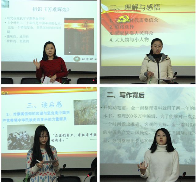 研一学生:杜玥:辉煌往往与苦难相伴,只有历尽艰难,才能像凤凰涅盘,重获新生。今天有机会和离退休老干部交流读书心得,感触颇深。他们用自身岁月的积淀阐明共产党员的使命,他们用落地有声的话语展现共产党员的信仰。中华民族是书香历史之民族,要相信我们青年一代肩负中华走向复兴之使命,用信仰凝聚力量,用精神引领辉煌,和各位老干部交流的不仅是党一路走来的风雨历程,更是他们看待国家摆脱苦难的决心和走向繁荣的信心,和他们交流的不仅仅是知识,更是人生。高杨:与年近半百的前辈交流,从他们身上散发出的对知识的渴望深深地感染着我。真正印证了那句话:—活到老,学到老。让我印象最深的是两个词—青年,信念。青年是国家的希望,信念是引领我们继续前进的力量。刘钟基:这次读书活动给我留下了很深的印象,主要有以下两点感悟,第一点是老干部,老同志们严谨的治学态度,从文章的逻辑到词句的考量都非常细致,最后还不忘叮嘱我们应该如何做学问。第二点是对于信念的执着,信念是一个人前进的动力,而老同志们对信念的执着给了我很大的触动。苏荣:今天从与老党员的交流中我感悟出了两个字:信仰。无论过去还是现在,老党员怀揣对共产主义的信仰,才会激发他们对祖国奉献的热情。当代中国人最缺少的就是信仰,信仰的缺失导致各种问题的出现。因此,目前最紧迫的任务就是重塑国人信仰。王鹏:今天下午参加北理工离退休干部的《苦难辉煌》读书活动,离退休老干部和同学们一同说学习、谈感悟、讲理想。通过与离退休老干部的交流,使历史事件更加立体、形象的展现在我们面前,使我们青年学生坚定信念,不忘初心,不断锤炼意志作风;要加强学习,提高修养,不断提升自身综合能力,为实现中华民族伟大复兴而奋斗。王启慧:理想和信念的力量是无穷的。历史是相对的,辩证的。过去相对未来是历史。我们作为后来人,正在续写着历史,必须接过先辈们的接力棒,跑好属于自己的一程,做好历史的传承者,创造者。张秀:生命不息,读书不止,热情不灭,信仰不断是这次读书交流会给我的最大感触。我们不光要有发现美的眼睛,也要具备倾听感动的耳朵。不管是周末天津行到达的西开教堂,看见那些虔诚的人儿;还是今天见到的这些白发苍苍的老干部,都让我动容。因为他们有信念!他们对历史抱着一颗尊重敬仰的心,他们也愿意相信中国的年轻一代是祖国的未来,他们愿意看到事物的真善美的一面,对生活、对学术都是怀揣信念,永葆热情!世人终将离世,但信念不朽,望我们每个人都不要停止相信,都能用发现美的眼睛、倾听感动的耳朵去看待世间万物。愿信仰成为深入我们骨髓的习惯!许婉萍:老一辈知识分子的情怀让人动容,对国家的信仰,对青年人的信心都让人感触颇深。对于书名《苦难辉煌》的探讨,并在此基础上对青年学生未来的发展提出了殷切希望,也让人看到了他们在学术上的严谨与认真。裴振磊: 今天下午参加《苦难辉煌》读书会,感慨颇多,收获颇多。此次读书会的独特之处不在书,在人。参加此次读书会的是离退休的老干部,年龄最大的高龄98岁的吴教授。仅这份心系年轻人的精髓就足以激励我们去不畏艰难创造辉煌。