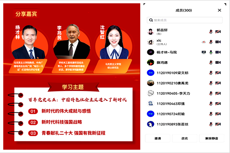 在二十大胜利召开前夕,很荣幸有机会参加学校关工委组织的百年党史老少共学系列活动的第五期党课。不同年龄段的退休教师、思政课教师和青年学生各自分享感悟,让我们再次感受到党的辉煌历程,特别是新时代青年一代的重任和担当。党走过百年风雨,现在走向伟大的民族复兴。作为新时代的青年要学习党史,坚定理想和信念,把青年理想和青春抱负熔铸在脚踏实地的奋斗中。作为一名计算机学院的学生,我一定努力掌握科学技术,为科技强国建设奉献自己的一份力量。